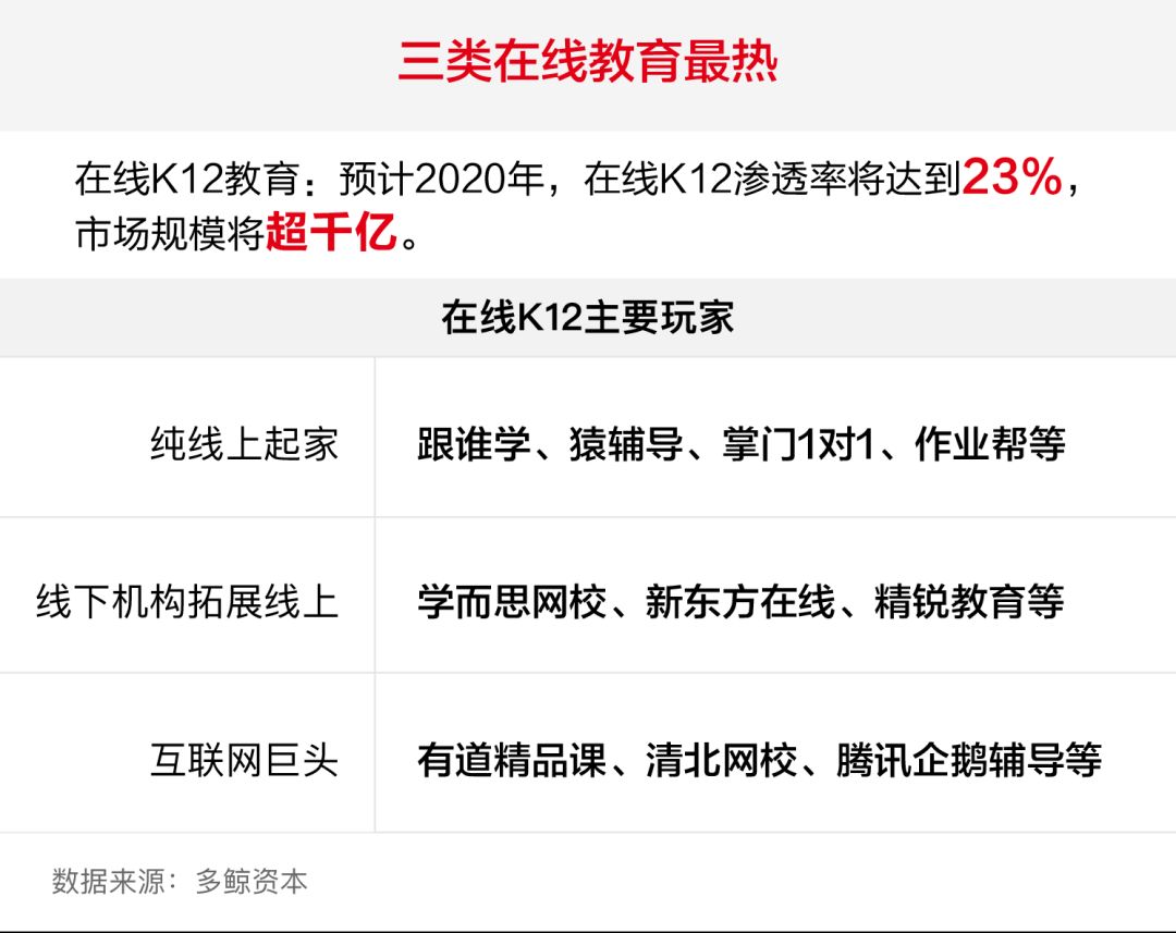 隨著升學競爭的長期存在,K12課外輔導已經(jīng)成為不可動搖的需要。多鯨資本數(shù)據(jù)顯示,截至2018年,國內(nèi)K12學生人數(shù)超過1.74億,相應的K12課外輔導市場超過4000億元。傳統(tǒng)教育機構、互聯(lián)網(wǎng)巨頭、互聯(lián)網(wǎng)團隊等不同背景的創(chuàng)業(yè)者紛紛涌入,以英語、數(shù)學為主。其中優(yōu)質(zhì)項目吸金能力強,紅杉中國、GGV、IDG等一線資本均完成布局。過去一年,在線k12企業(yè)融資金額最高的是“一對一”E輪融資,融資金額3.5億美元;其次是“小盒子科技”1.5億美元的D輪融資。